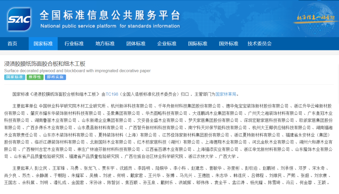 近日,由國家林業和草原局主管,中國林業科學研究院木材工業研究所、科天集團旗下子公司 南寧科天環保節能科技有限公司等45家行業權威機構及領先企業聯合起草的GB/T 34722—2025《浸漬膠膜紙飾面細木工板和膠合板》推薦性國家標準,已由國家市場監管總局、國家標準化管理委員會正式發布(2025年5月30日),并將于2025年12月1日起正式實施。